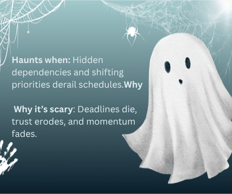 The Deadline Phantom thrives in chaos, whispering “there’s plenty of time” until a missed dependency or resource conflict derails the schedule. Teams work late, confidence drops, and every stand-up feels like a séance to recover lost time.
